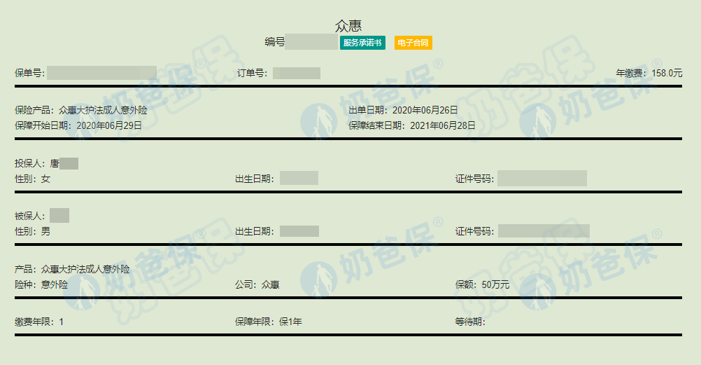 2020年6月26日,唐女士通过奶爸保的规划师方圆,给自己的丈夫买了一份众惠大护法成人意外险尊享版,保费158元,保单在2020年6月29日生效。