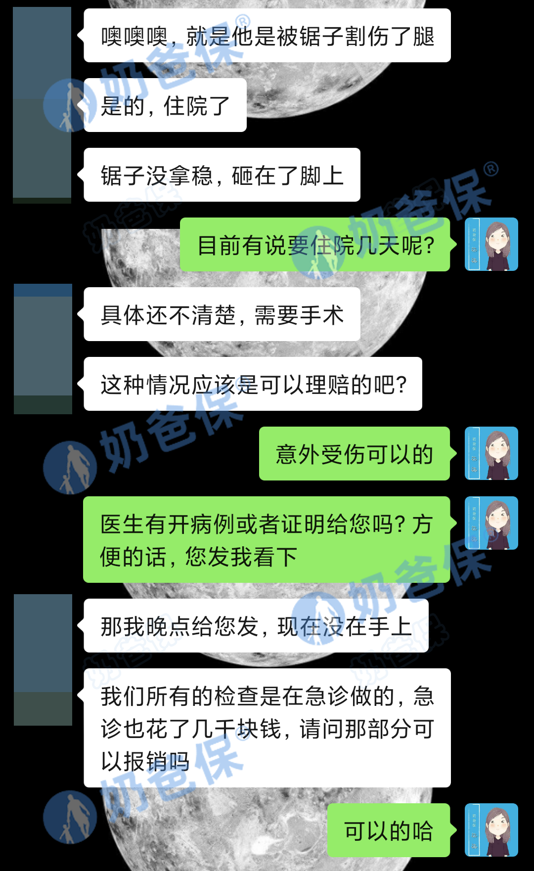 意外发生后,唐女士立刻陪同丈夫前往医院,经医生诊断,需要手术治疗,唐女士办理好住院手术后就联系奶爸保的理赔老师柒柒。