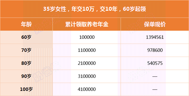 我们以35岁女性投保,年交10万,交10年,60岁起年领为例: