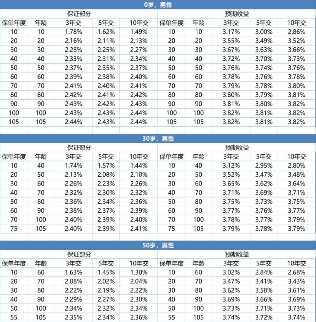 再看包含预期在交清增额的收益,3年交在早期的收益上会有一些优势,第10年就超过3%,但是所有缴别在第20年也基本都可以达到3.5%,远末端的话甚至可以达到3.82%