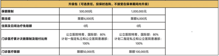 取消了住院免赔额,既往症额度提升至6000,年度总保额和门诊限额均有提升。