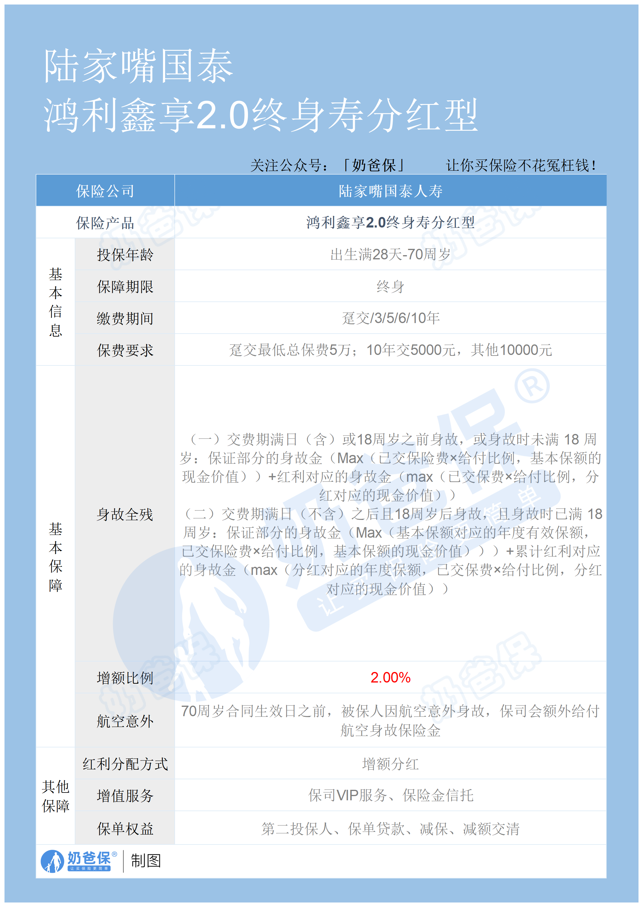 鸿利鑫享2.0终身寿分红型是陆家嘴国泰人寿推出的一款保额递增2.0%的分红型增额寿险产品。