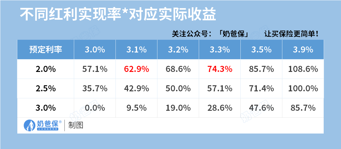 在预定利率2.0%年代,红利实现率超过57%左右,分红IRR就有机会达到3%;