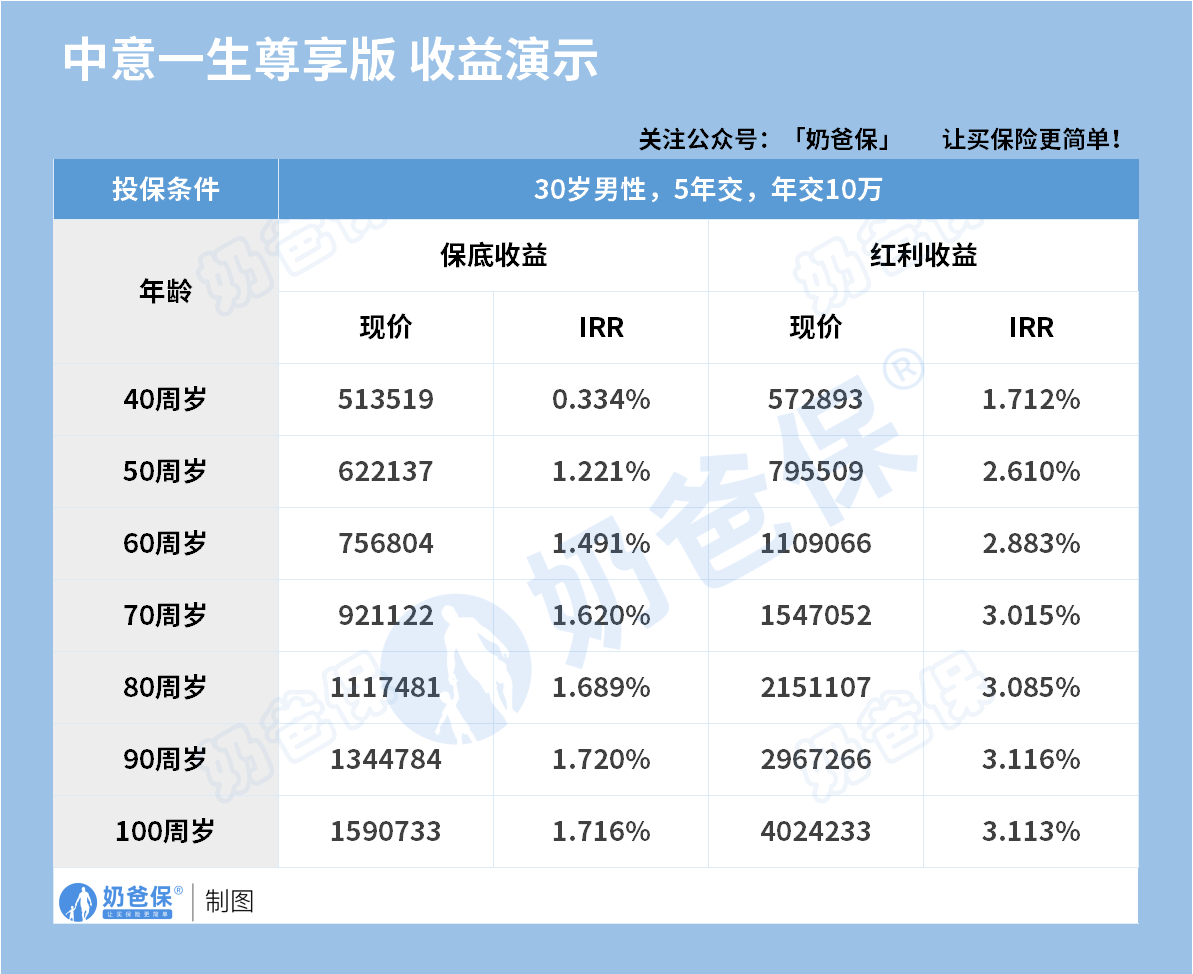 30岁男性,年交10万,交5年,看看热门产品中意一生尊享版终身寿险分红型的收益情况: