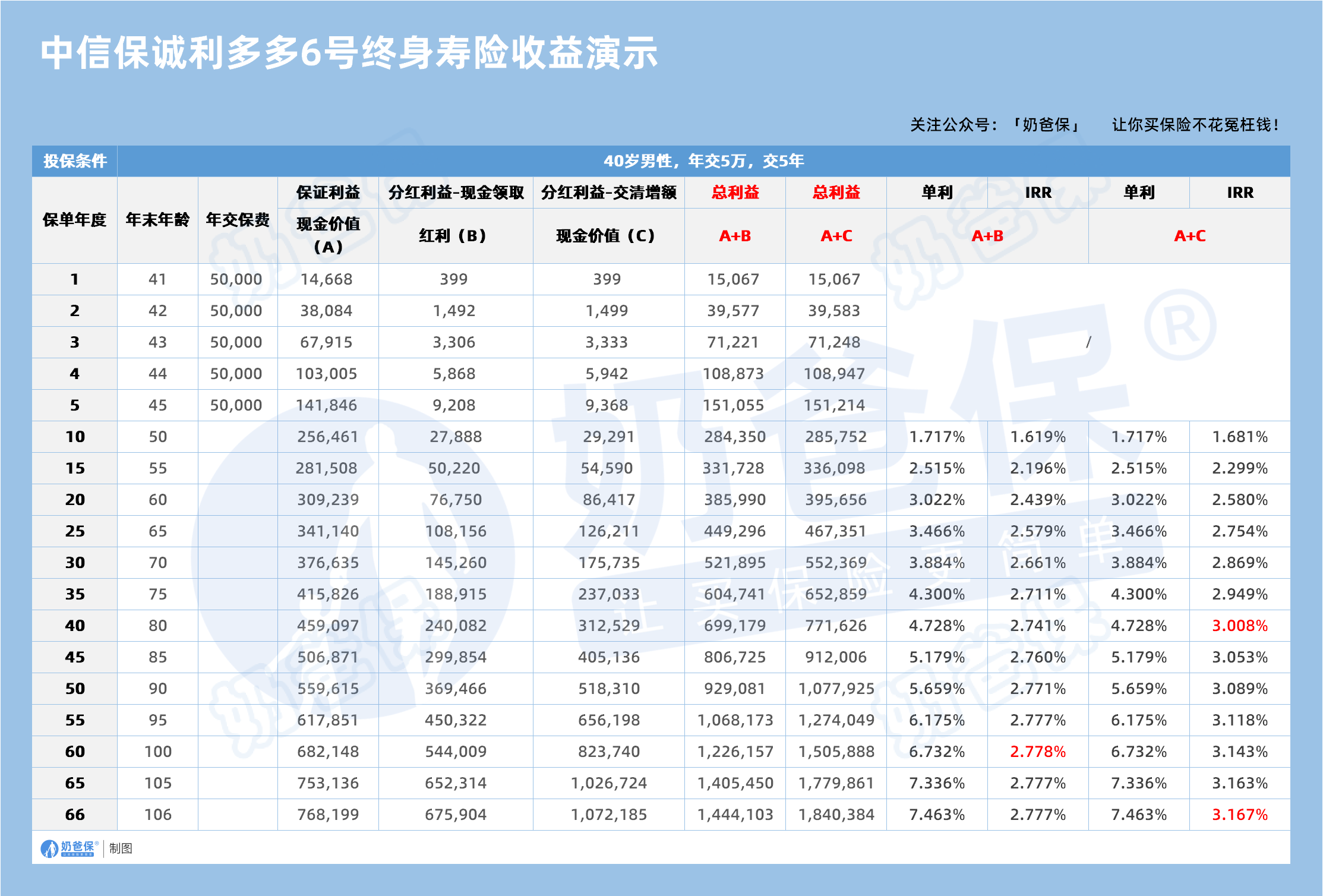 奶爸以40岁男性,年交5万元,连续交5年为例,看看关键节点的收益情况: