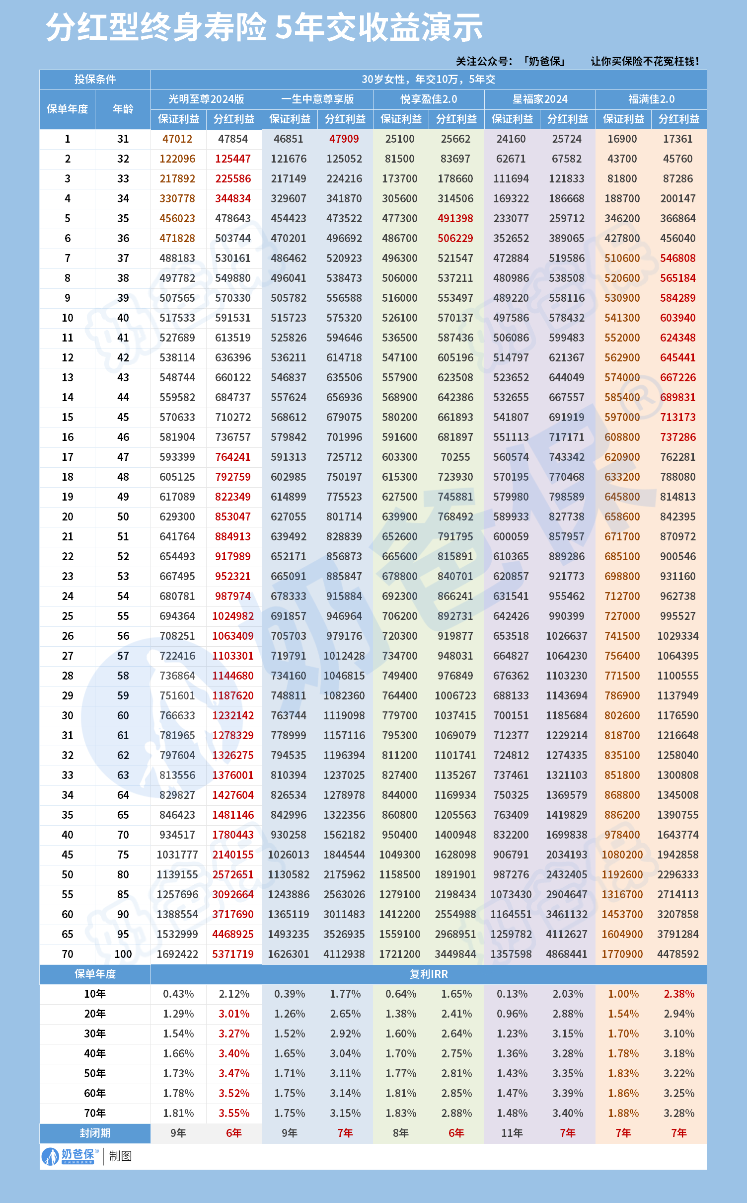 以30岁男性,年交10万,交5年为例子: