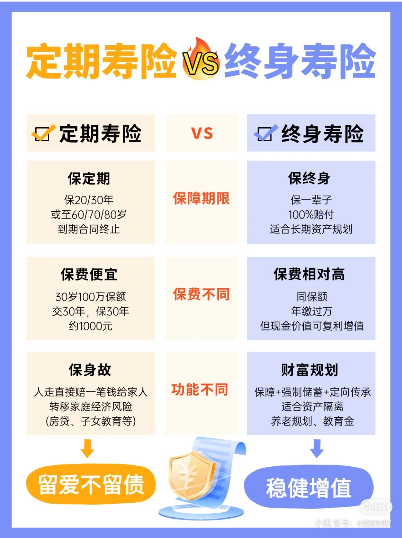 简单说:定期寿险保“活着的时候的责任”,终身寿险保“离开后的传承”。