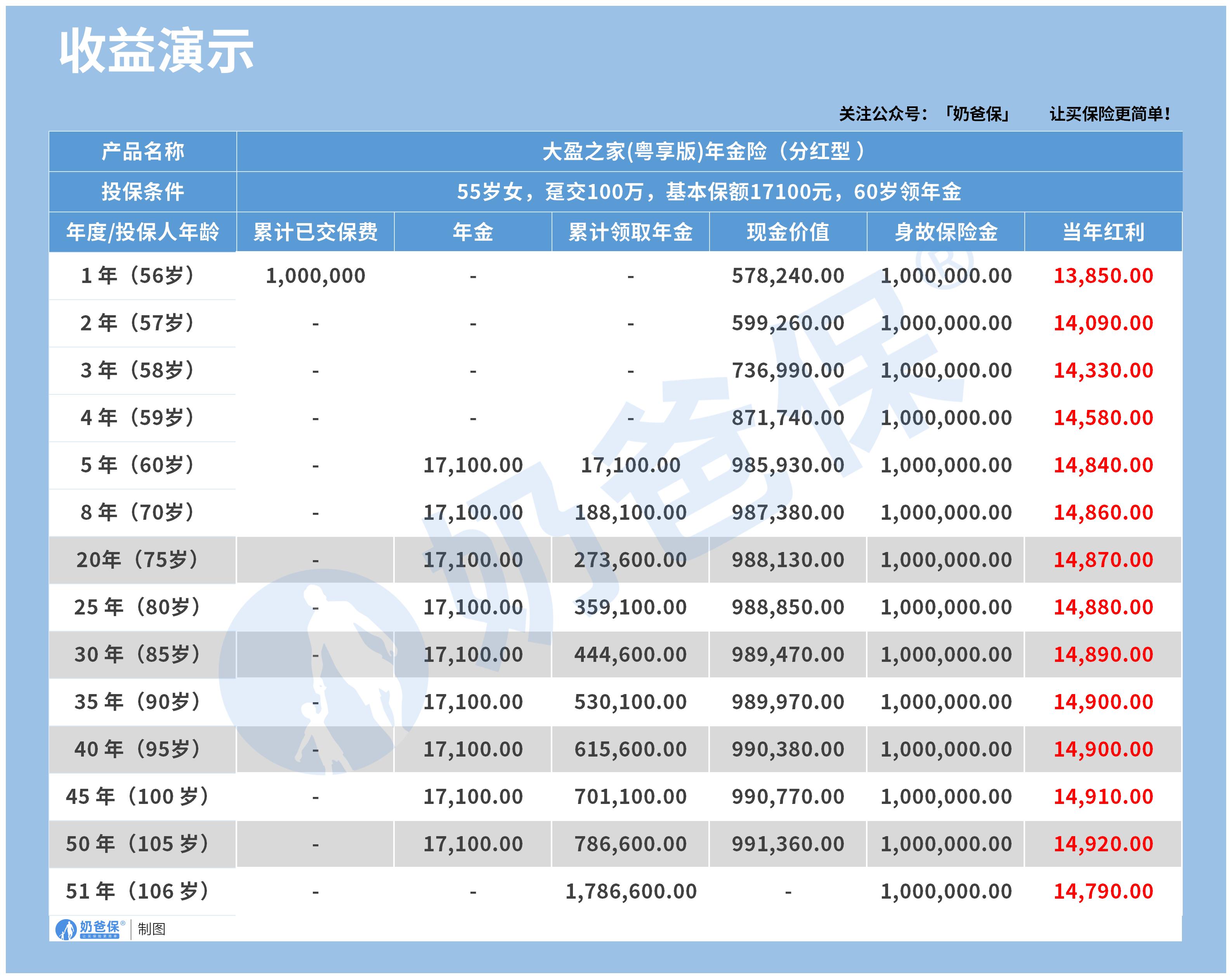 根据收益演示,她的基本保额是17100元,意味着她从60岁开始,每年可以领取17100元,相当于每月1425元。
