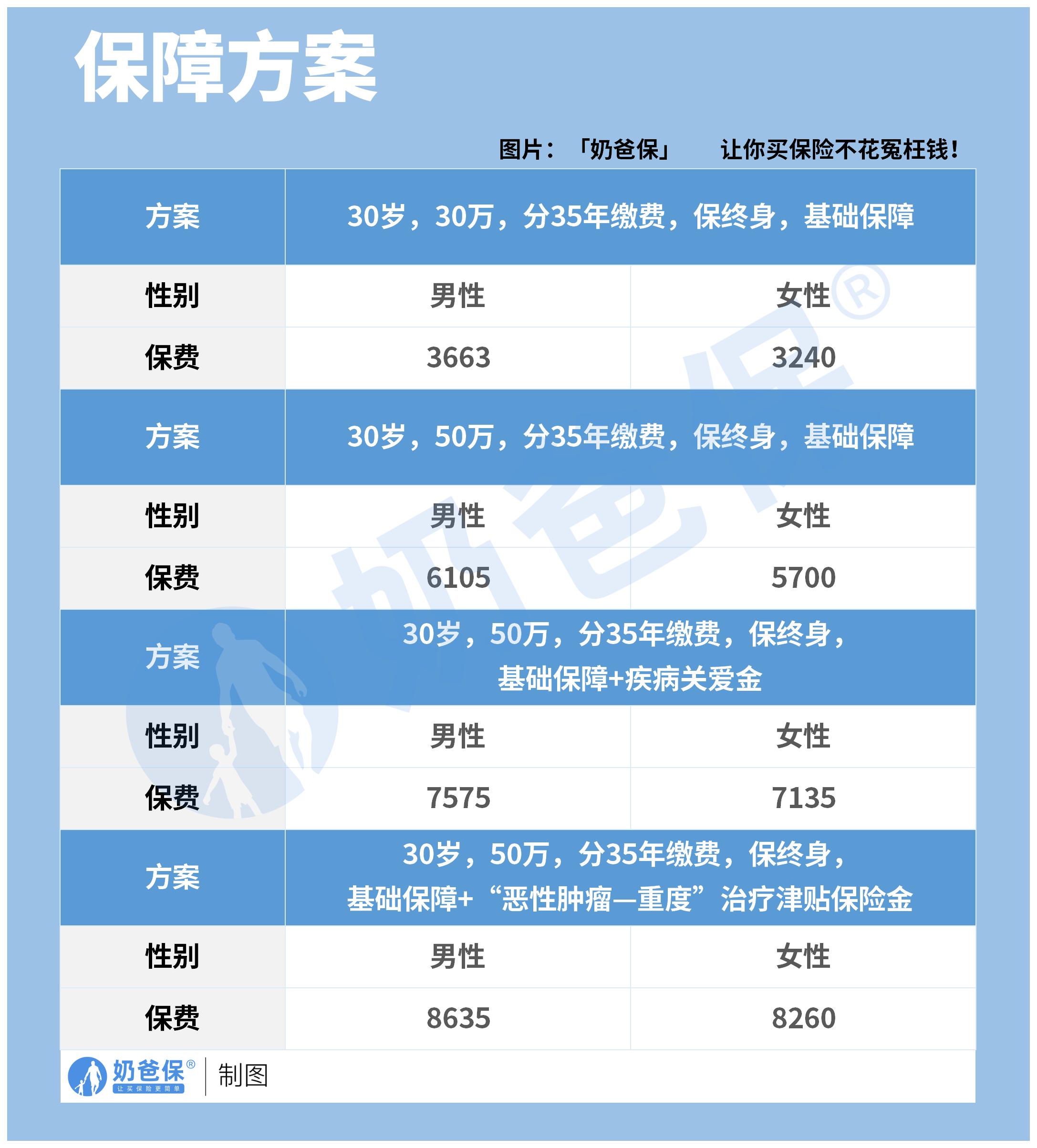 方案详情:30岁人群投保,30年缴费,保终身,保额50万,保障内容为基础保障+“恶性肿瘤—重度”治疗津贴保险金。