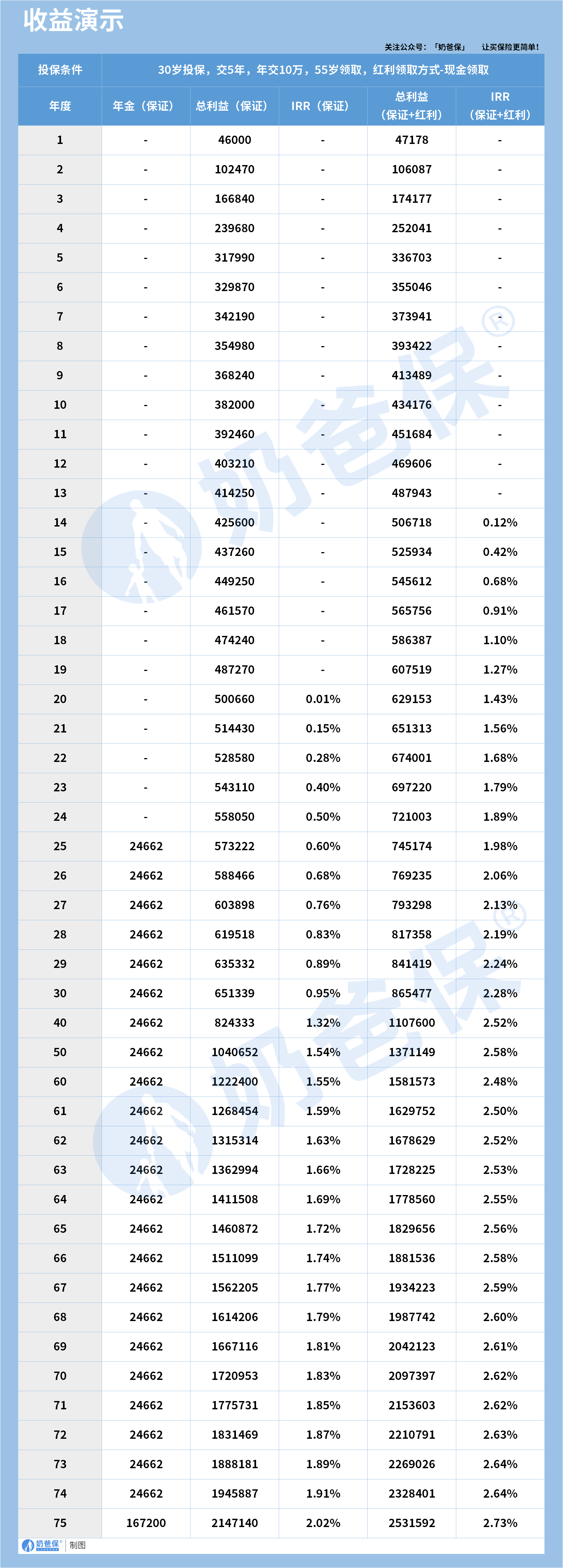 以30岁投保,每年交10万,交5年,55岁开始领养老金。