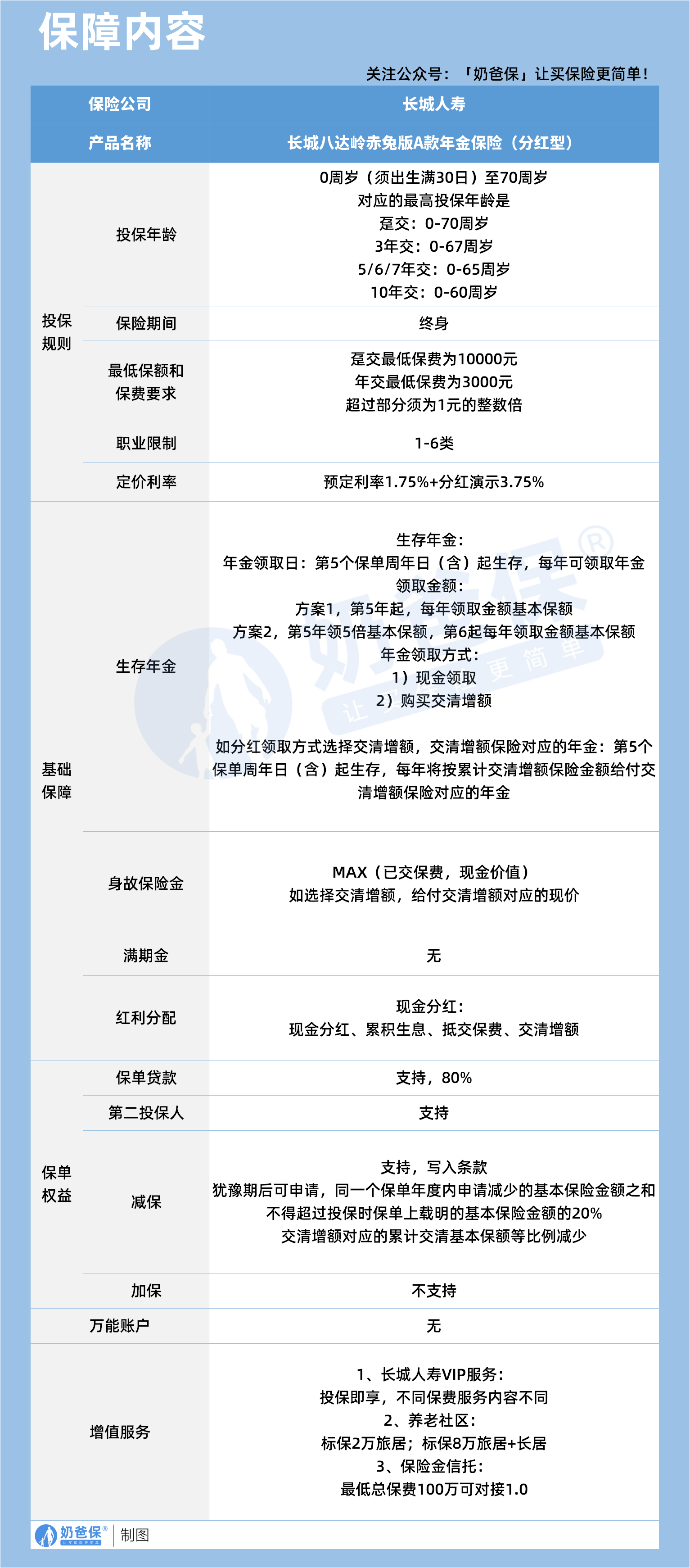 今天,奶爸要介绍的是长城人寿推出的新品——八达岭赤兔版A款年金保险(分红型)。