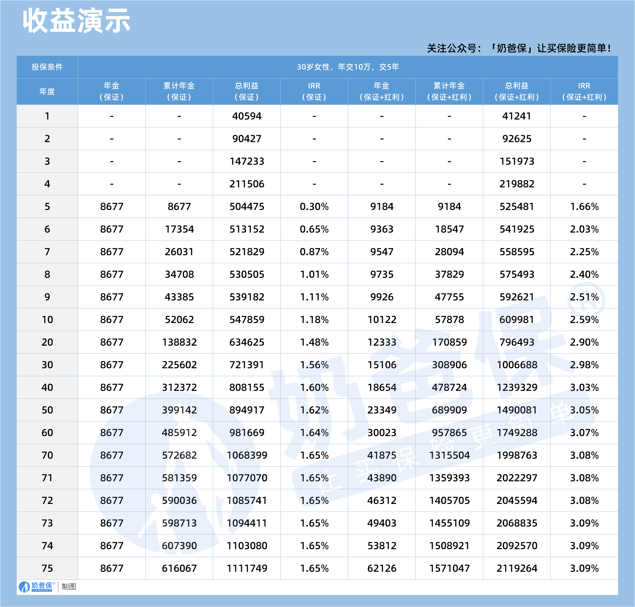 我们以30岁女性,年交10万元,交费5年的投保方案为例进行分析。