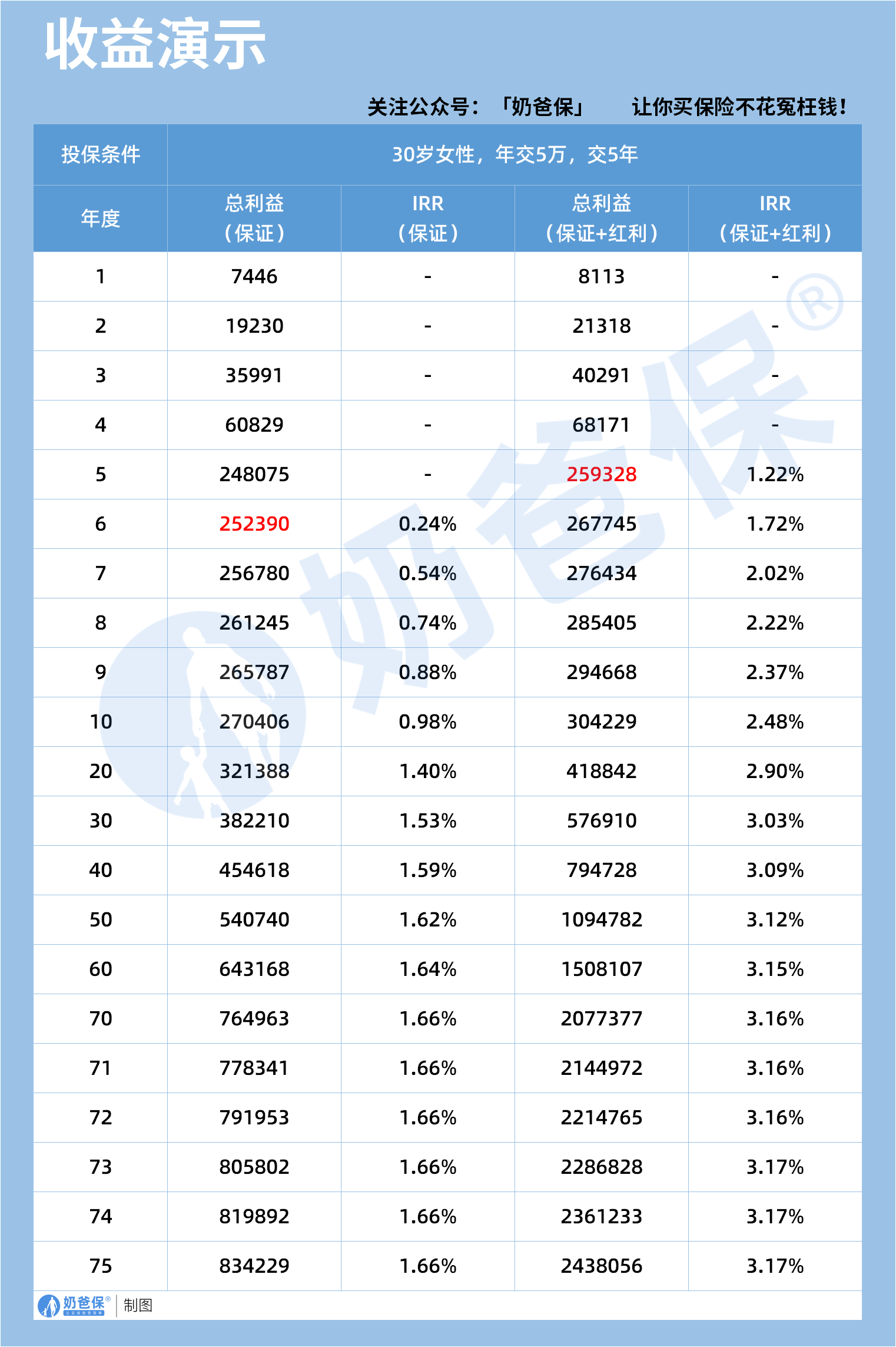 奶爸以30岁女性年交5万元、交5年的投保案例为例,