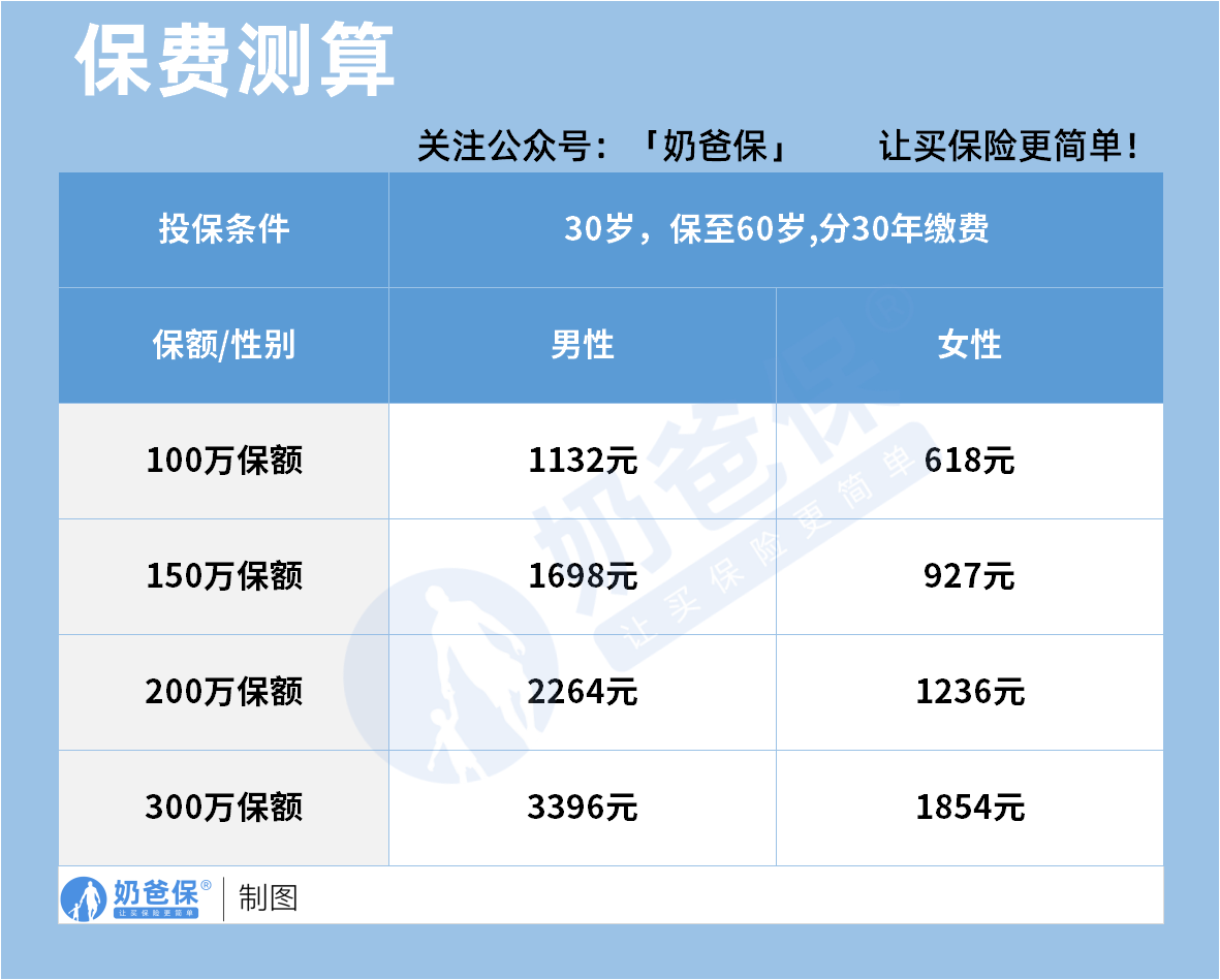 男性100万保额每年1132元,150万保额1698元,