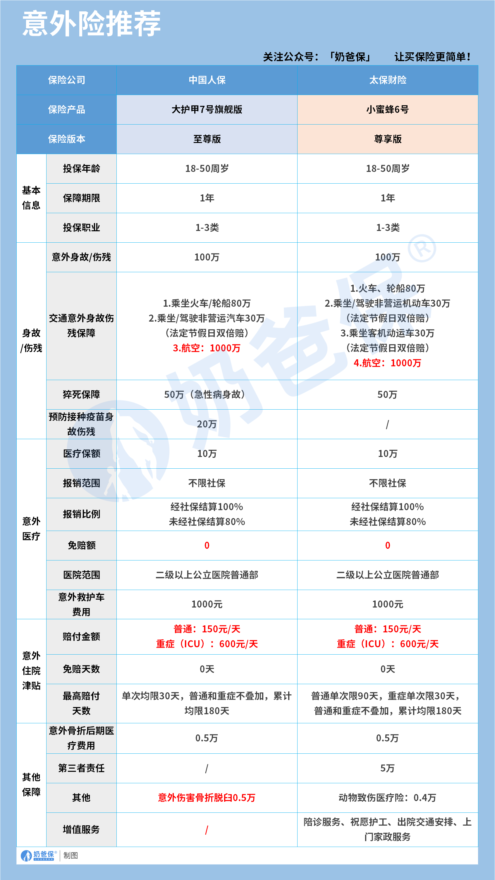 在意外险产品中,中国人保大护甲7号旗舰版(至尊版)和太保财险小蜜蜂6号(尊享版),是两款值得推荐的产品。