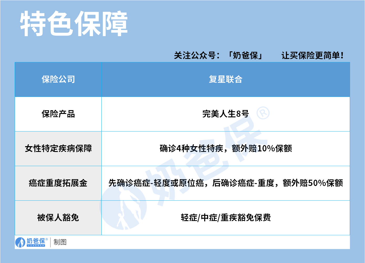 现在关注“奶爸保”公众号,回复“官网”,还可以免费领取价值199元的保障大礼包哦,让您买保险变得更简单。