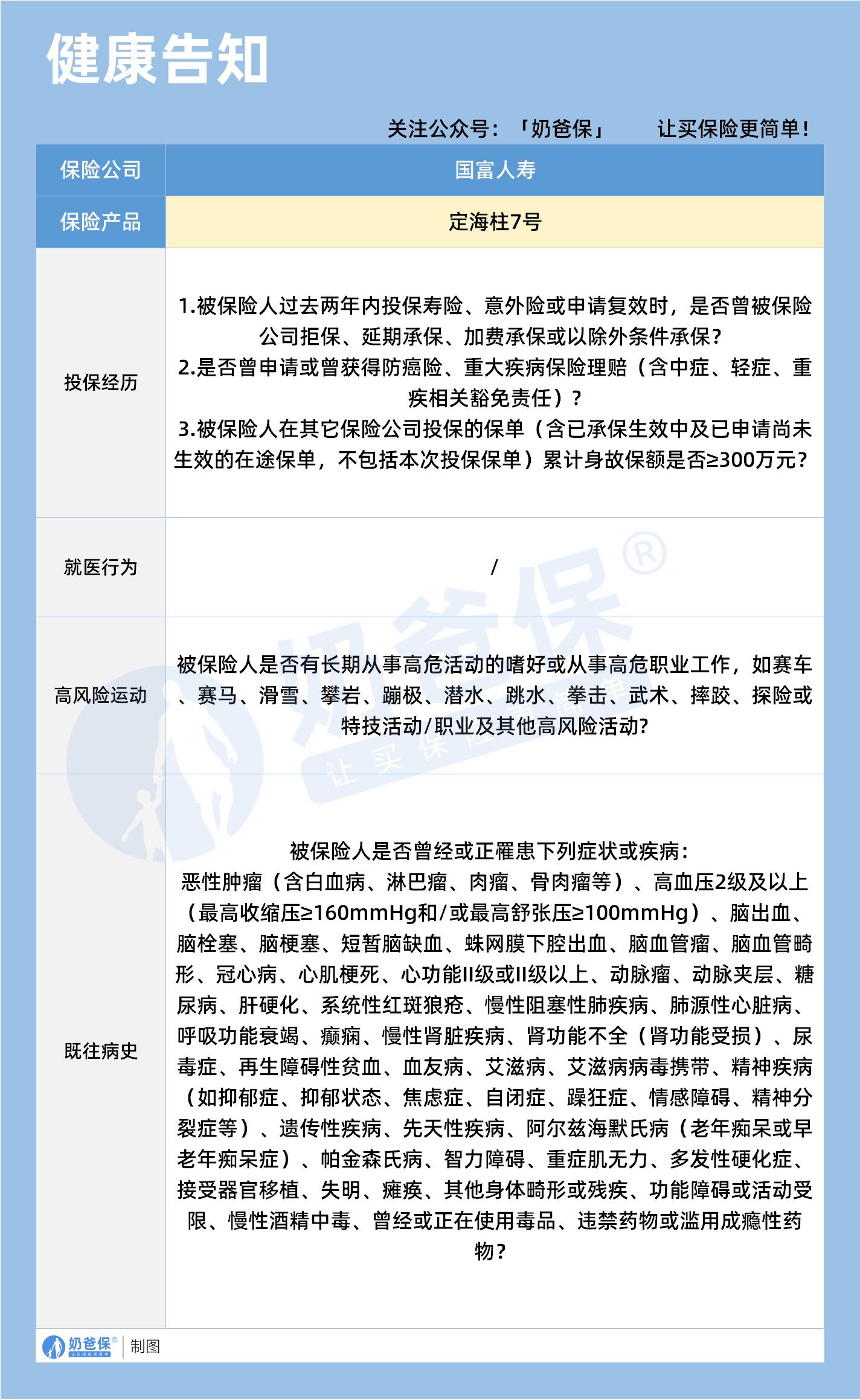具体来看,健康告知主要涉及三个方面:投保经历、高风险运动和既往病史。