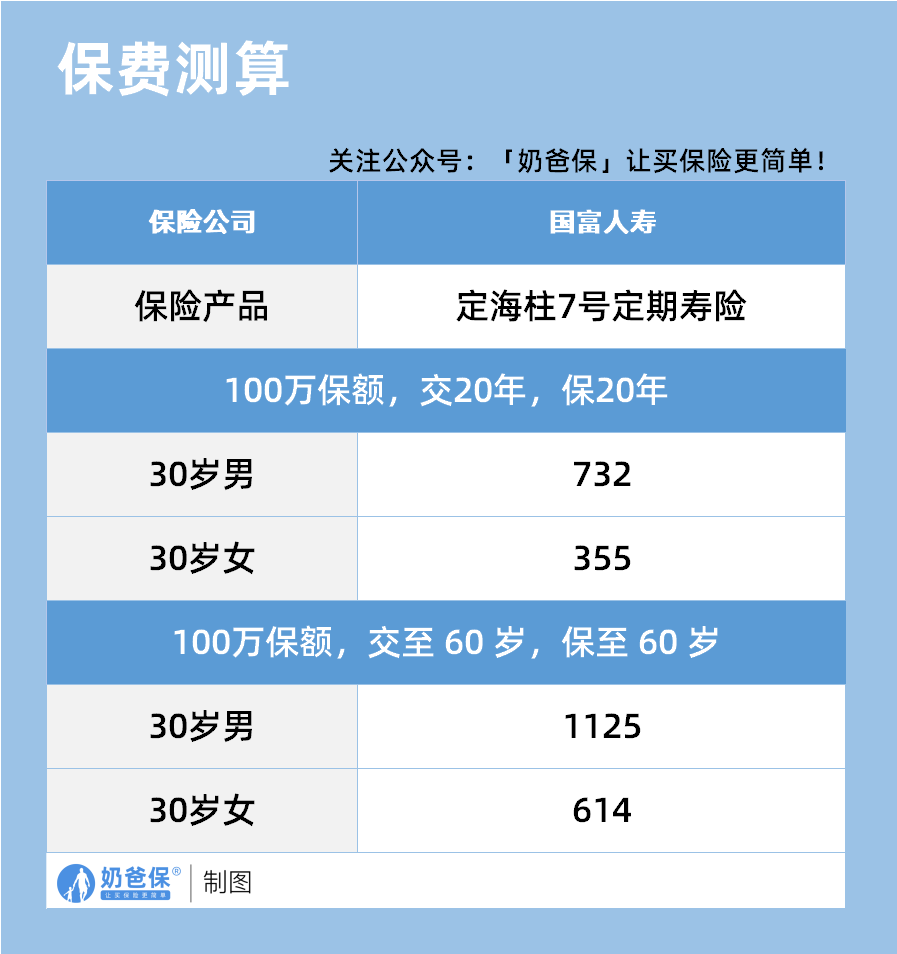 先看保费,以100万保额为例,交20年保20年,30岁男性每年保费732元,平均到每个月只有61元;