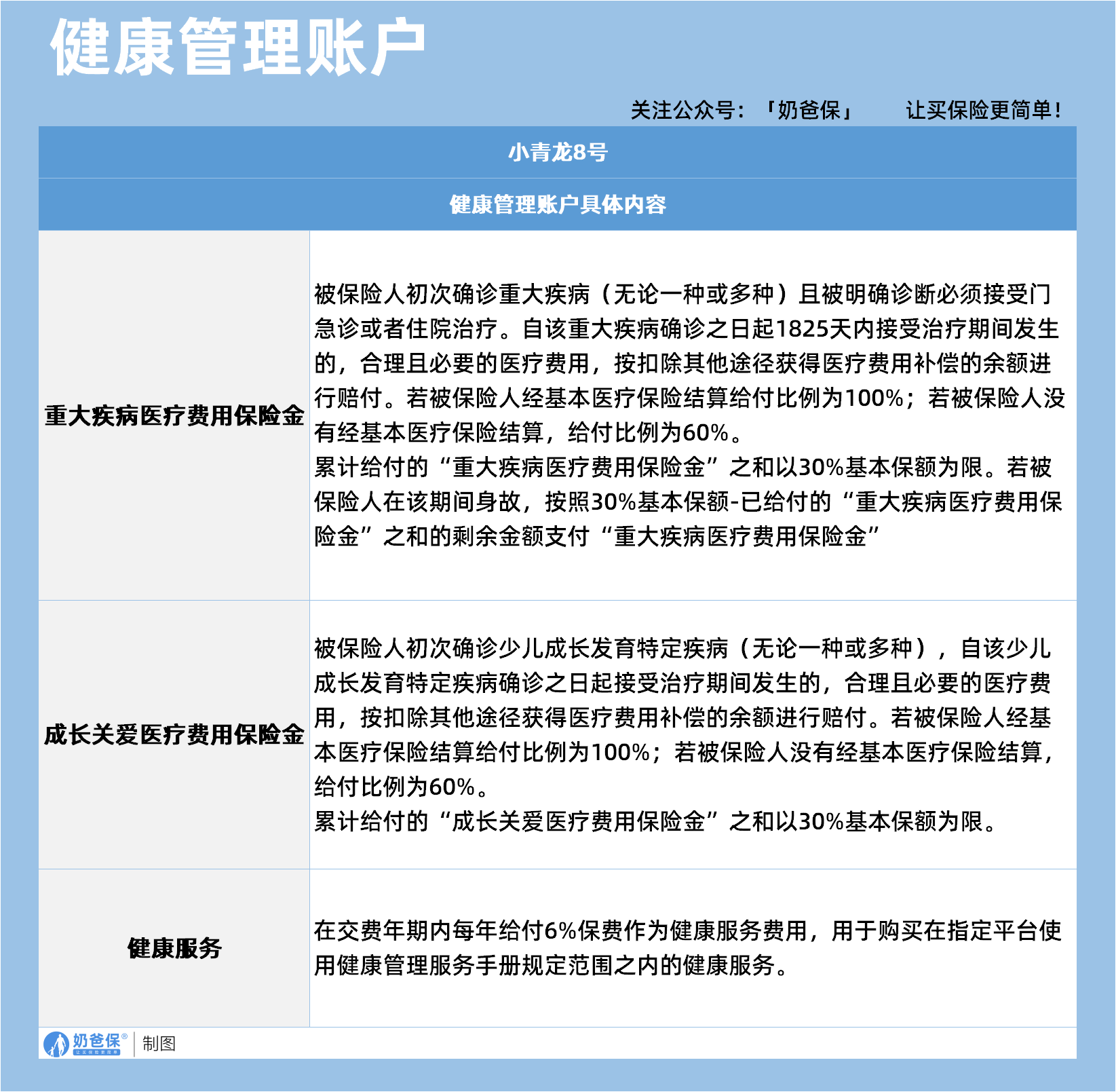 特色保障的差异化,是两款产品拉开差距的关键,其中小青龙8号的健康管理账户更是其独有的核心亮点。