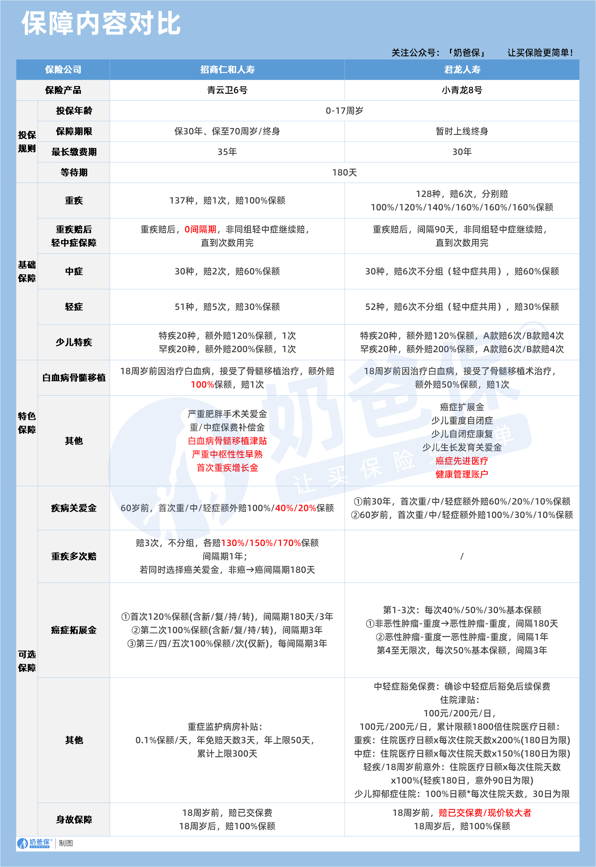 小青龙8号则仅提供终身保障,更适合希望一次性为孩子锁定终身重疾防护的家庭。