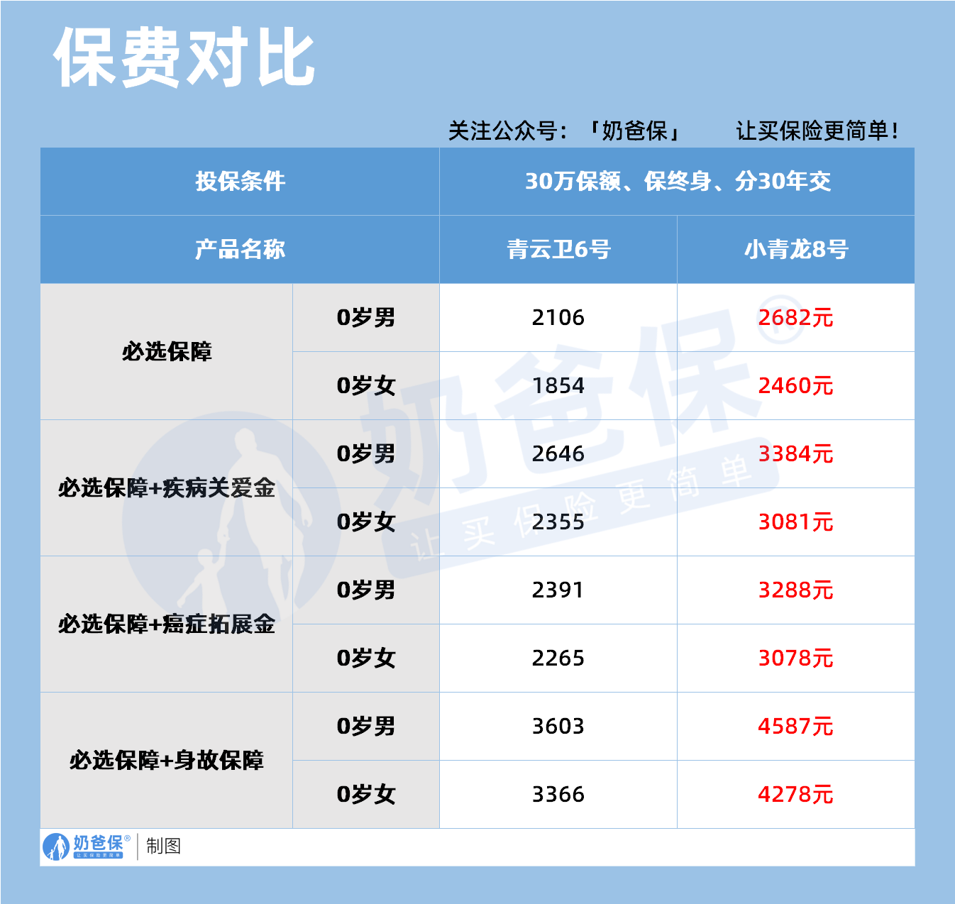 青云卫6号整体保费偏低,以0岁宝宝30万保额保终身分30年交为例,