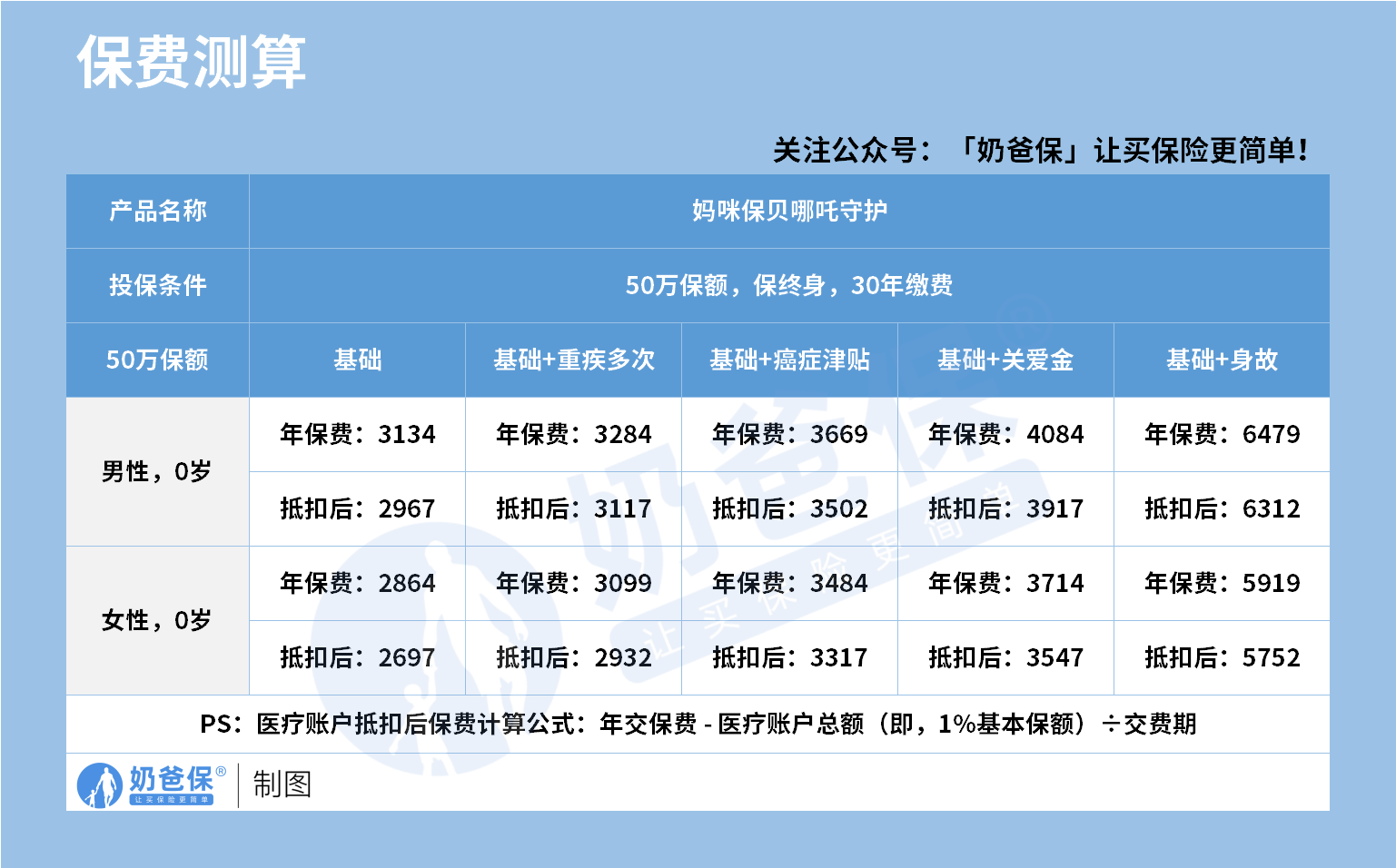 以50万保额、保终身、30年缴费为例,0岁男孩的基础责任年保费为3134元,经过医疗账户抵扣后,实际年交保费为2967元;