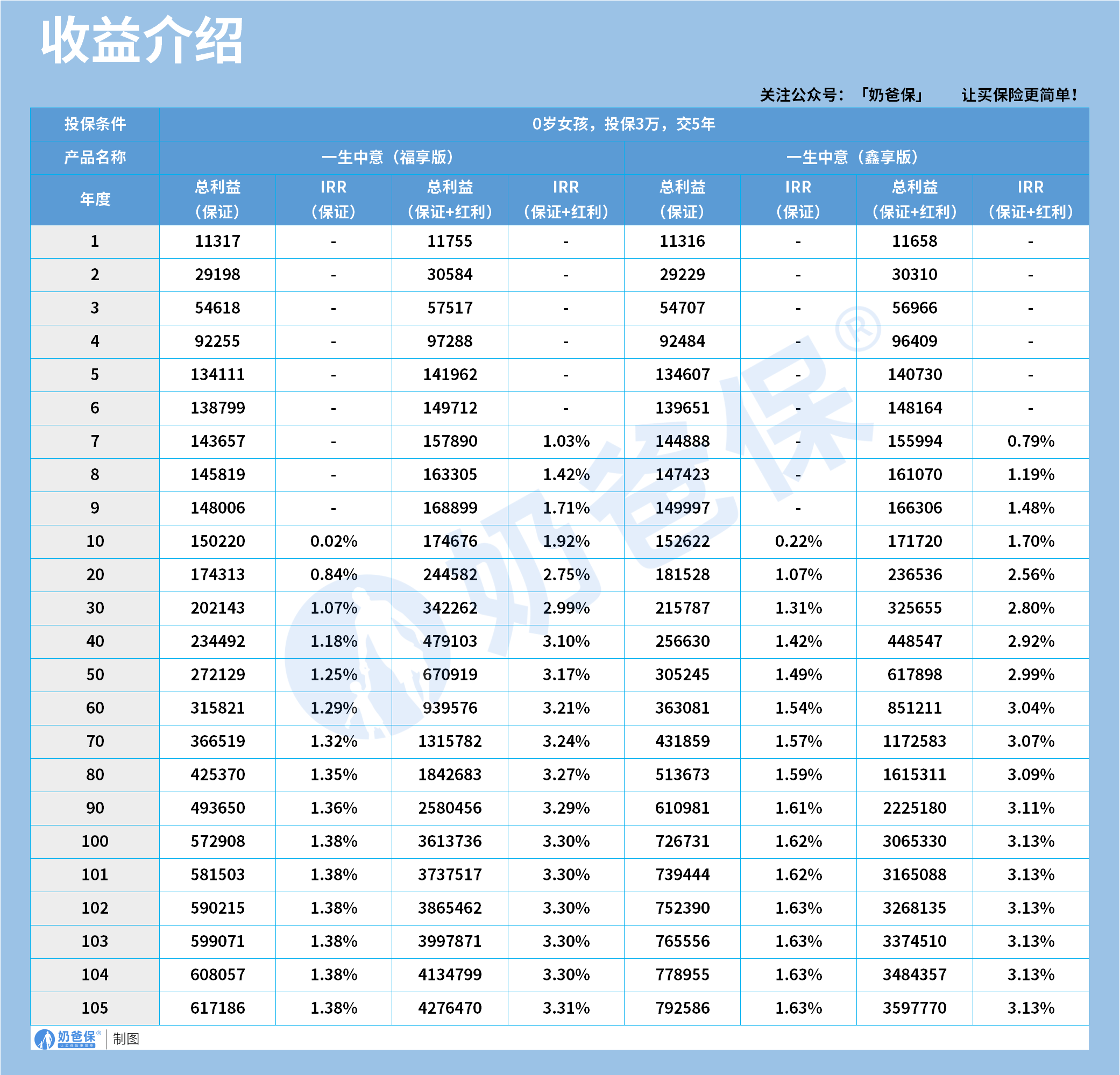 到第100年,保证IRR稳定在1.38%,而保证加红利的IRR则达到3.30%。