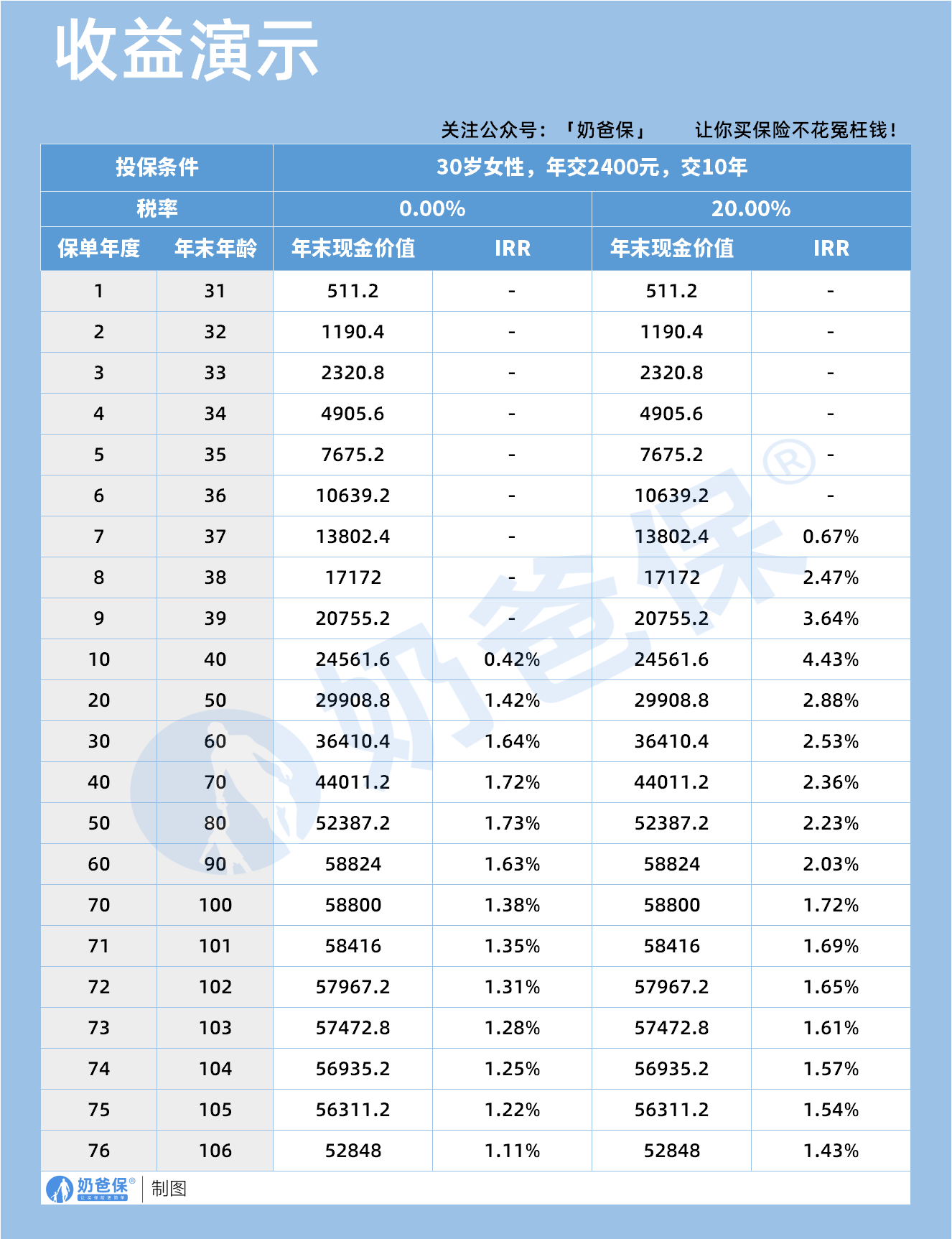 以 30 岁女性年交 2400 元、交 10 年的投保方案为演示案例,在 0 税率与 20% 税率两种场景下,现金价值与 IRR 表现各有差异。