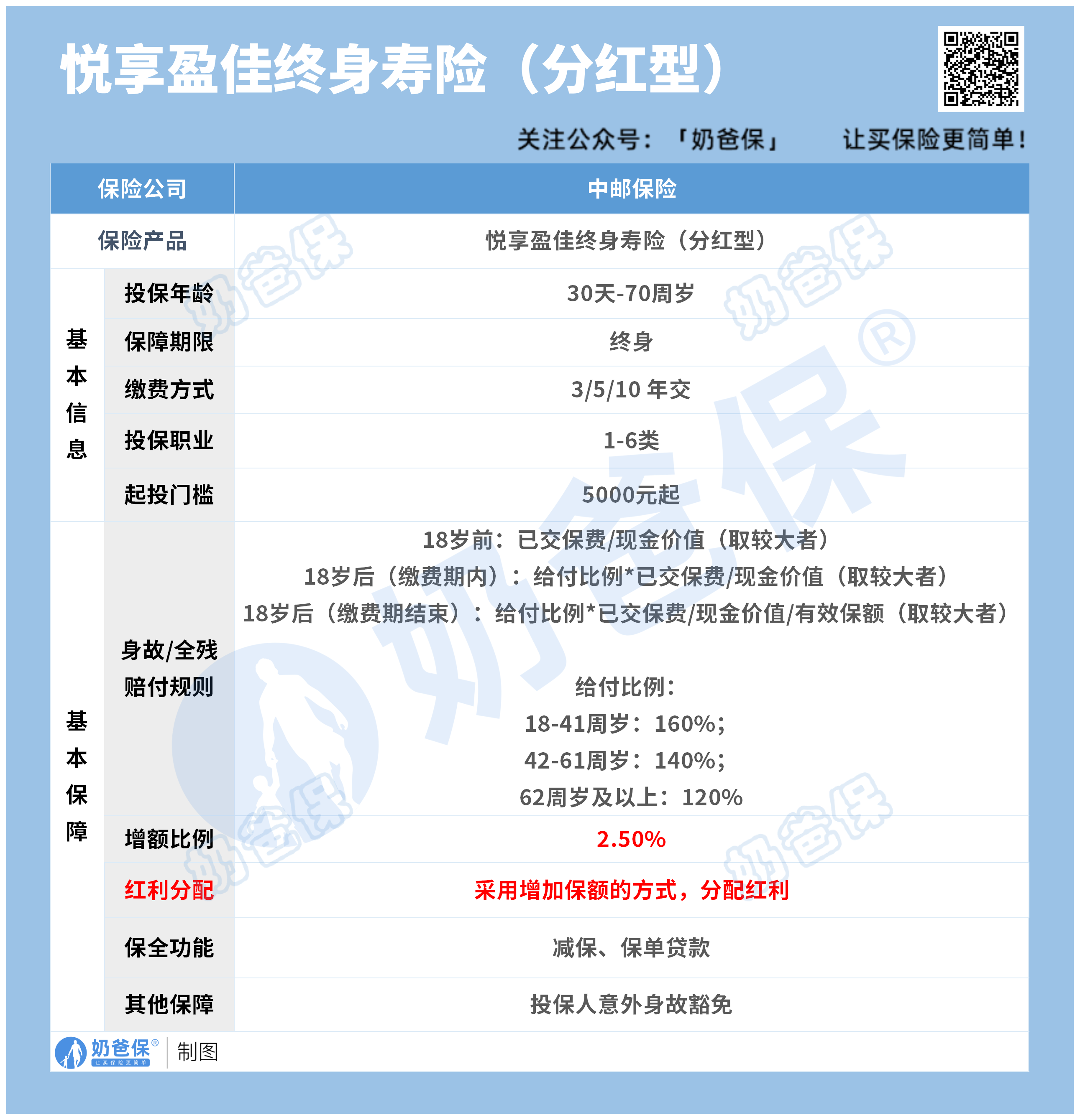 中邮人寿悦享盈佳是一款分红型增额终身寿险产品,