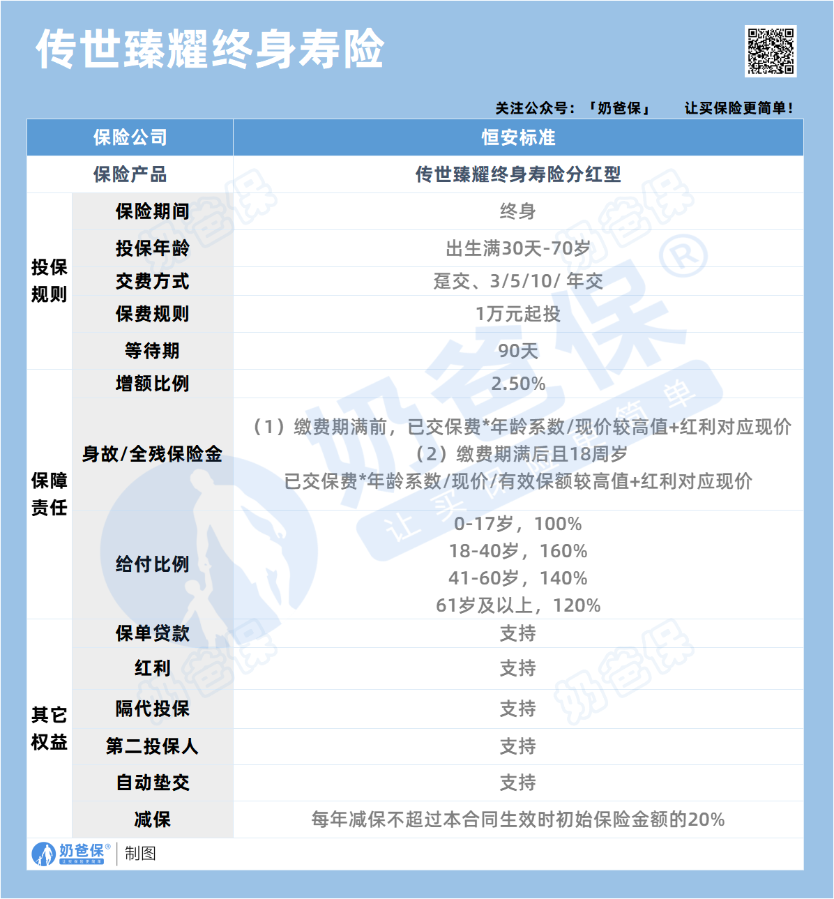 如果大家挑选保险有什么困难,可以扫码关注:奶爸保公众号 进行1对1咨询,现在关注“奶爸保”公众号,回复“官网”,还可以免费领取价值199元的保障大礼包哦,让您买保险变得更简单。
