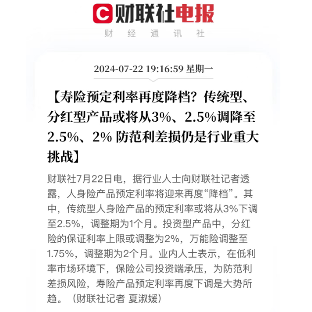 8月底之前,传统人身险,比如年金险、增额寿,重疾险等,预定利率要从3%降到2.5%;