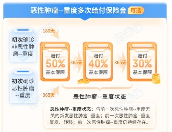 不同重疾之间赔付间隔1年,同种重疾赔付间隔仅2年。