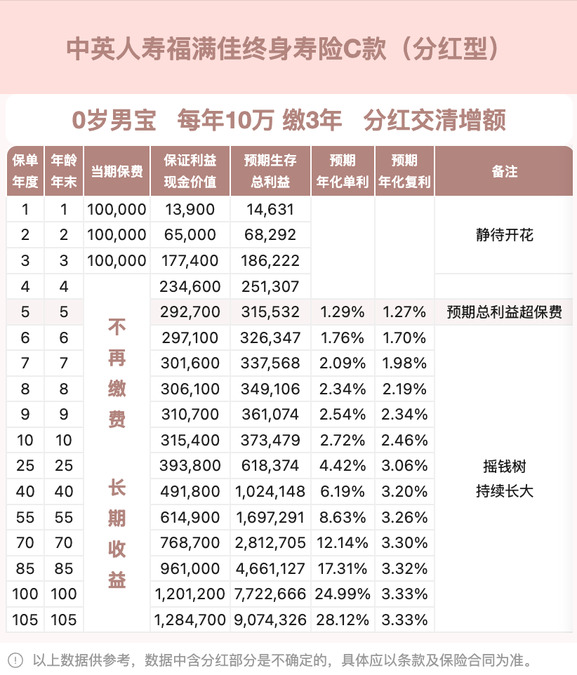 中英福满佳C款适合给孩子做长期资产规划(教育、传承等),短期缴费长期复利增值;