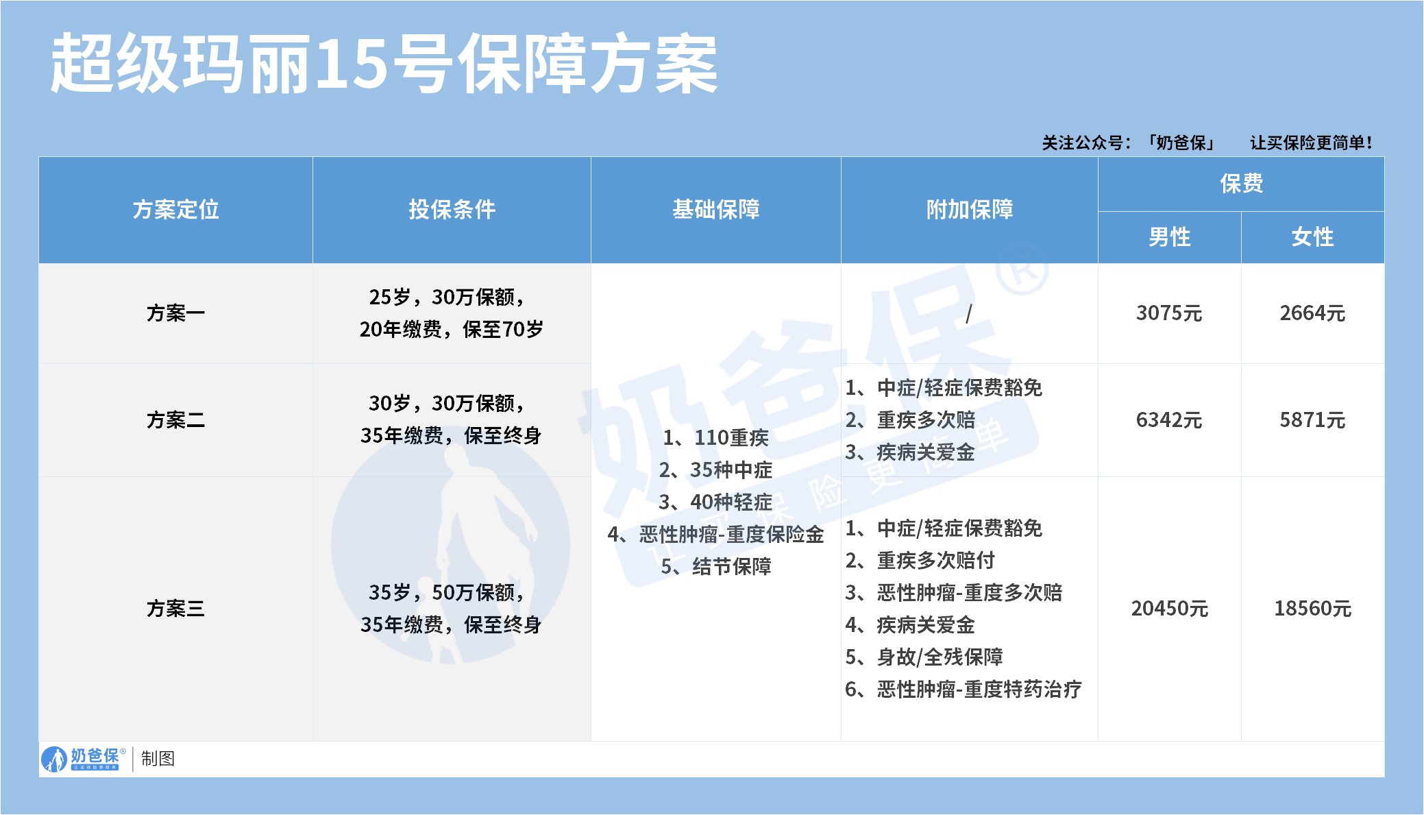 方案二(30 岁,30 万保额,保终身):男性年缴 6342 元、女性 5871 元(35 年缴)。这个方案是 “中年 + 终身 + 基础 + 部分附加”: