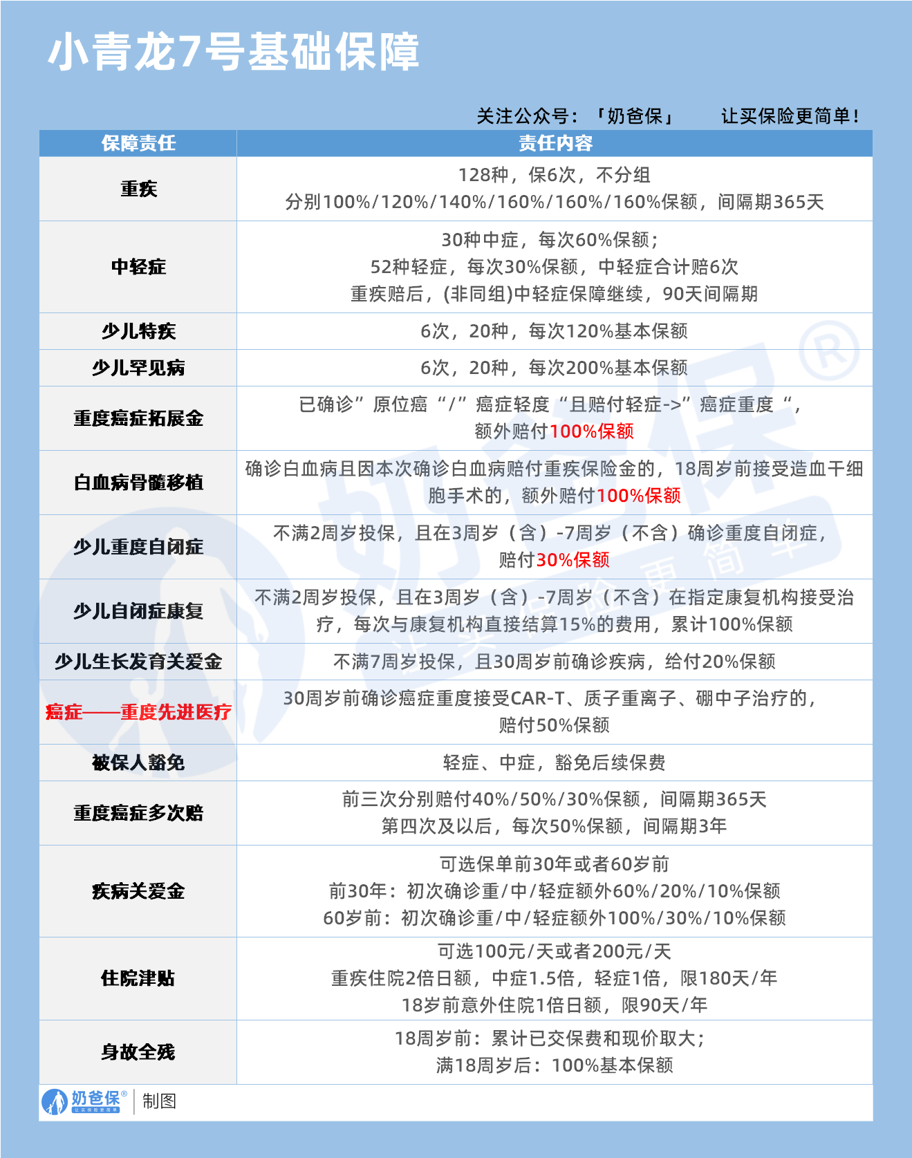 整体来看,小青龙 7 号的基础保障既扎实覆盖了重疾、轻中症核心风险,又通过细致的少儿专属责任贴合孩子需求,多次赔付与延续性保障让家长更安心。