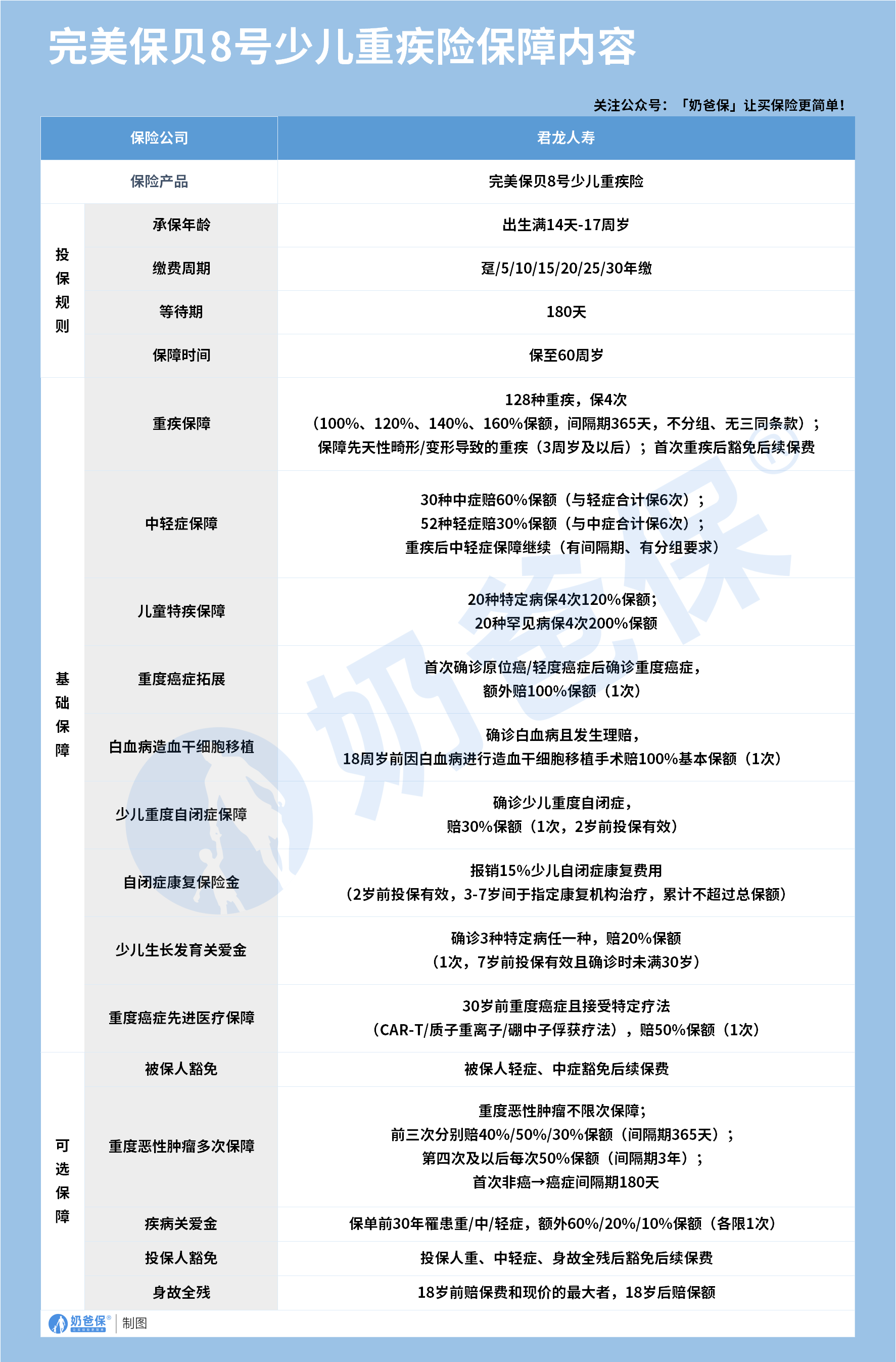 这位朋友你好,关于君龙人寿完美保贝8号重疾险保障如何?的问题,奶爸在这里整理了相关内容,希望对你有帮助: