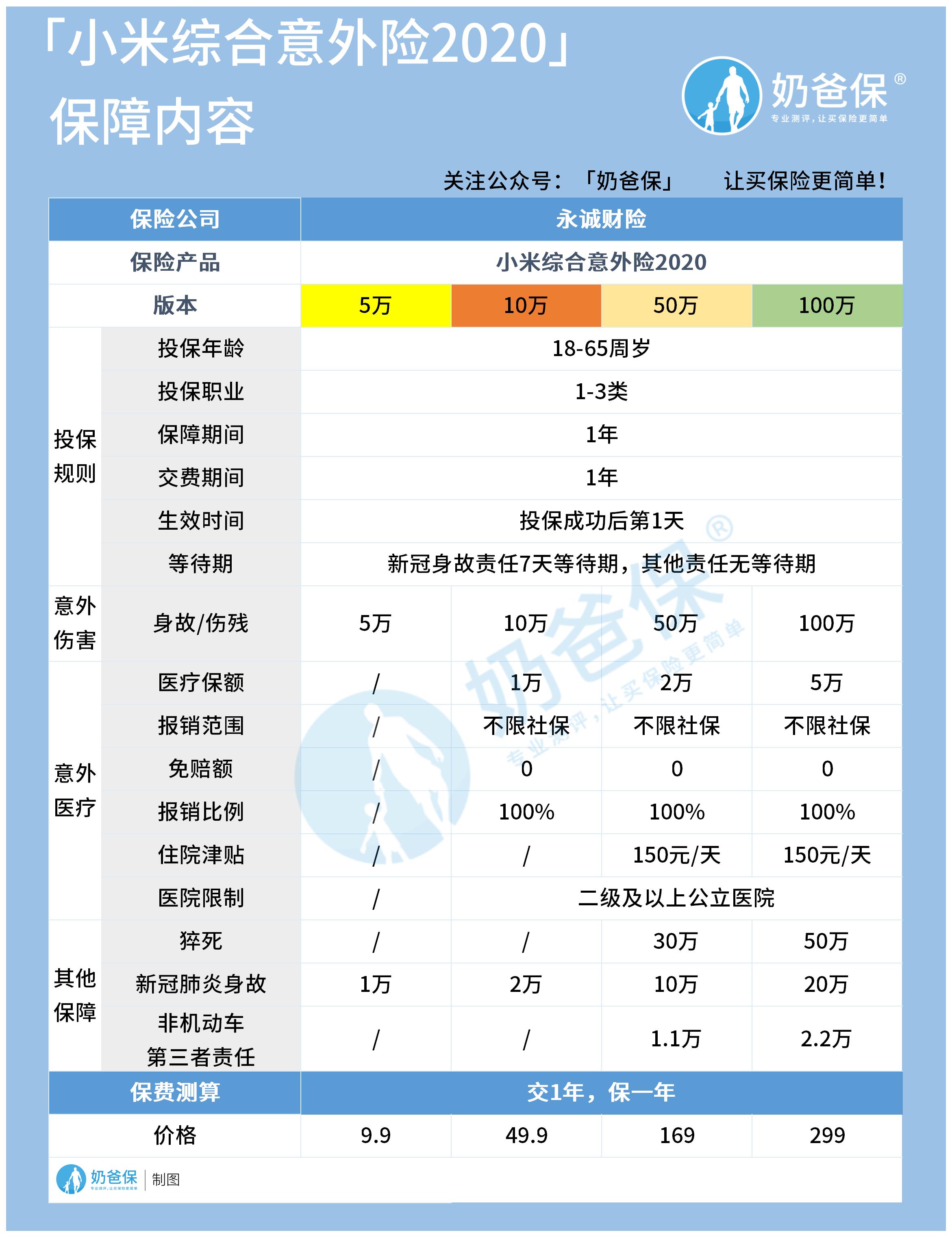 1、意外伤害保障小米综合意外险2020版对意外伤害导致的身故/伤残保障额度分别为5万元,10万元,50万元和100万元。它是根据它的意外身故保额命名的,接下来奶爸在分析时,说到不同的计划版本,也直接用保额区分。2、意外医疗保障这款产品的5万版本只有身故或者伤残保障,没有医疗保障,而10万元版的意外医疗保额有1万元,50万版是2万元,100万版有5万元保额。3、报销限制小米综合意外险2020版报销不限社保,医院限制在二级及以上公立医院,而且都是0免赔。4、住院津贴这款产品的50万和100万版本有意外住院津贴保障,都是150元/天。5、猝死保障小米综合意外险2020版后面两个计划版本有猝死保障,保额分别为30万和50万,同时四个版本都有新冠肺炎身故保障,保额分别为:1万,2万,10万和20万。