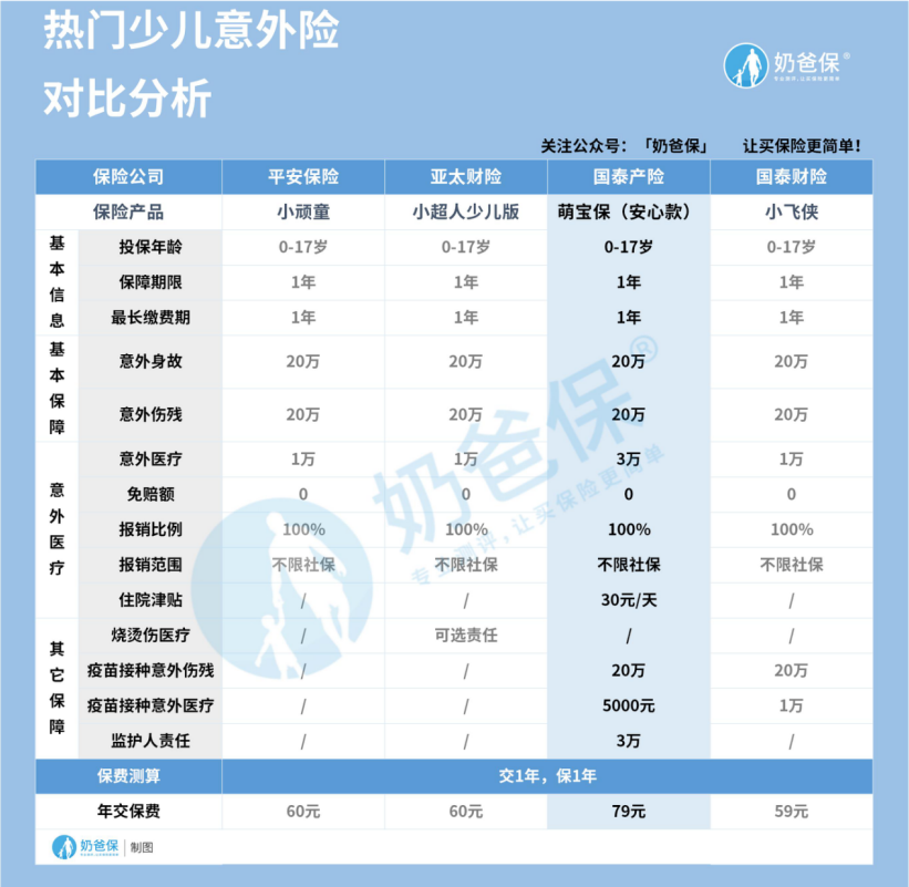 因为安心款是咨询比较多的,所以奶爸就选择这个版本跟市面上的热门少儿意外险做对比测评: